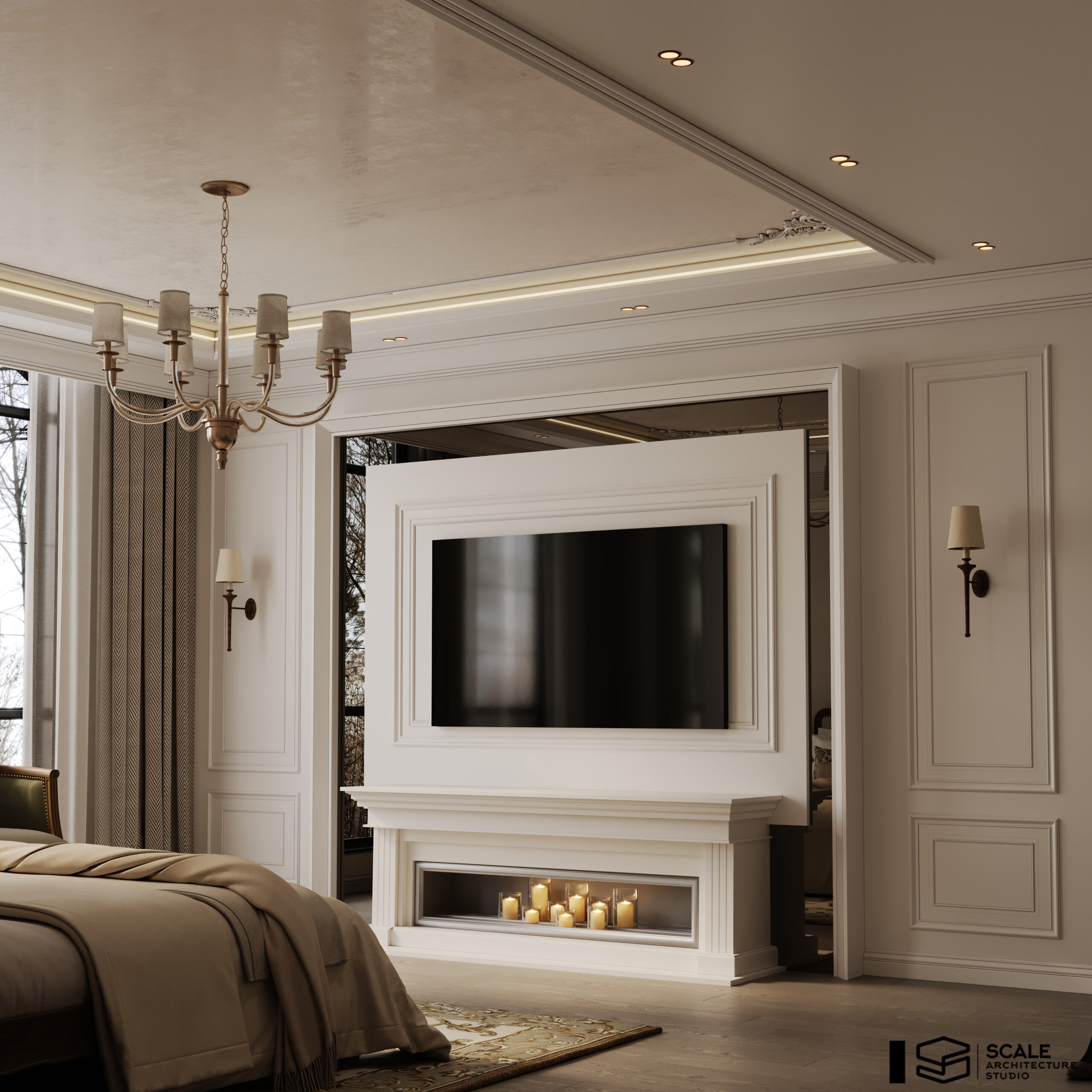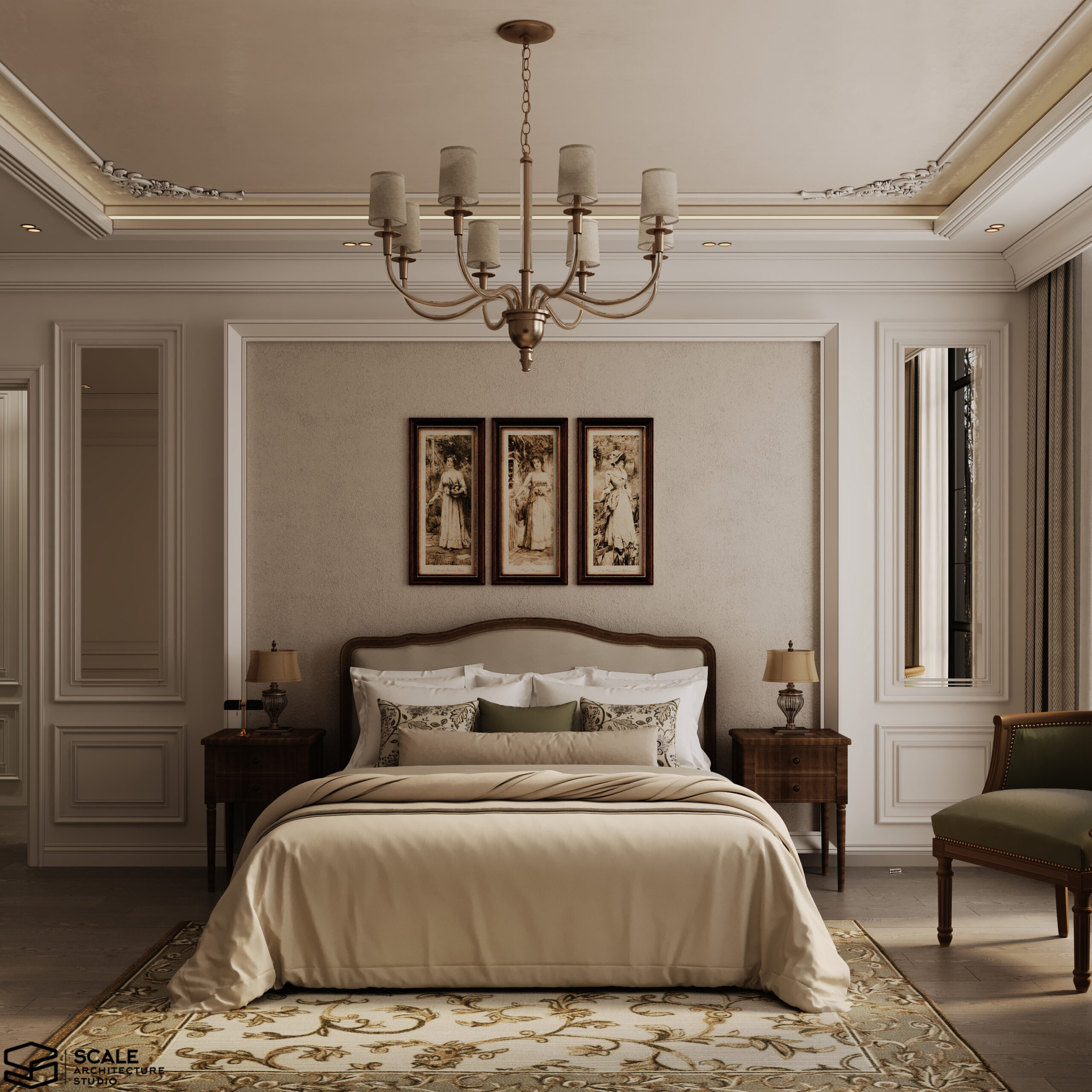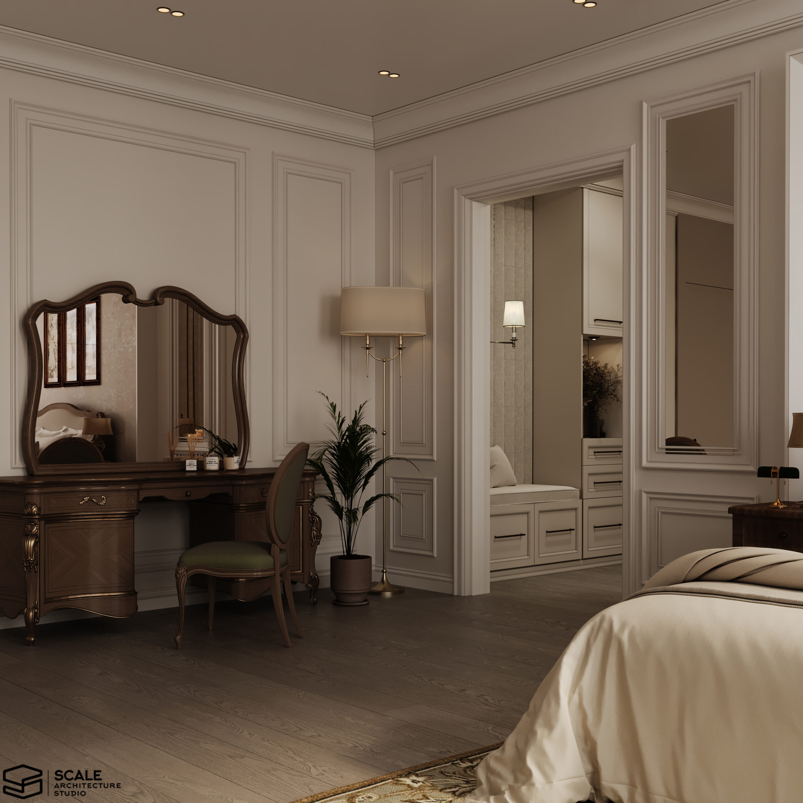 𝐃𝐞𝐬𝐜𝐫𝐢𝐩𝐭𝐢𝐨𝐧 : Our design for Master Bedroom with dressing & bathroom 𝐀𝐫𝐞𝐚 : 60 m2 𝐒𝐭𝐲𝐥𝐞 : Classic . 𝐒𝐨𝐟𝐭𝐰𝐚𝐫𝐞 : 3d max , corona render , photoshop 𝐋𝐨𝐜𝐚𝐭𝐞𝐝 : Quatar . 𝐘𝐞𝐚𝐫 : 2025